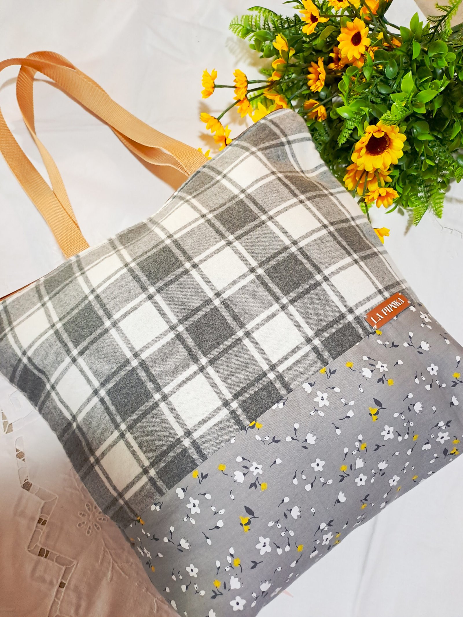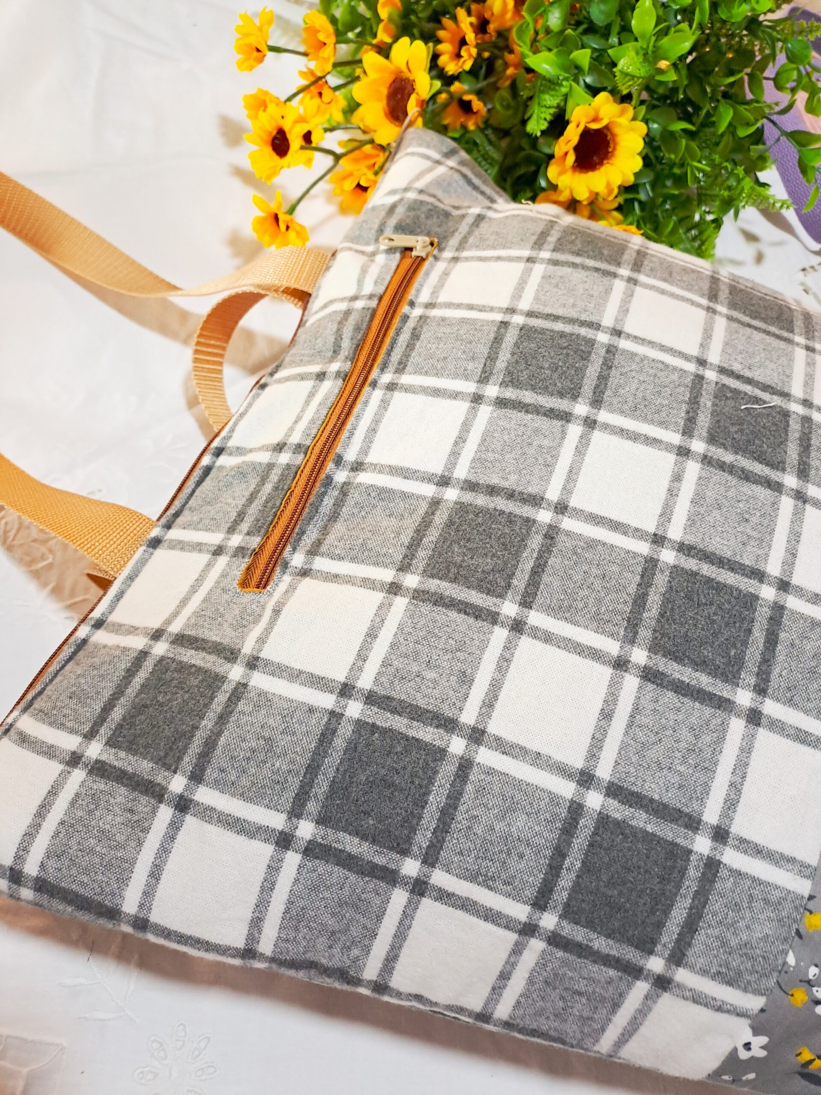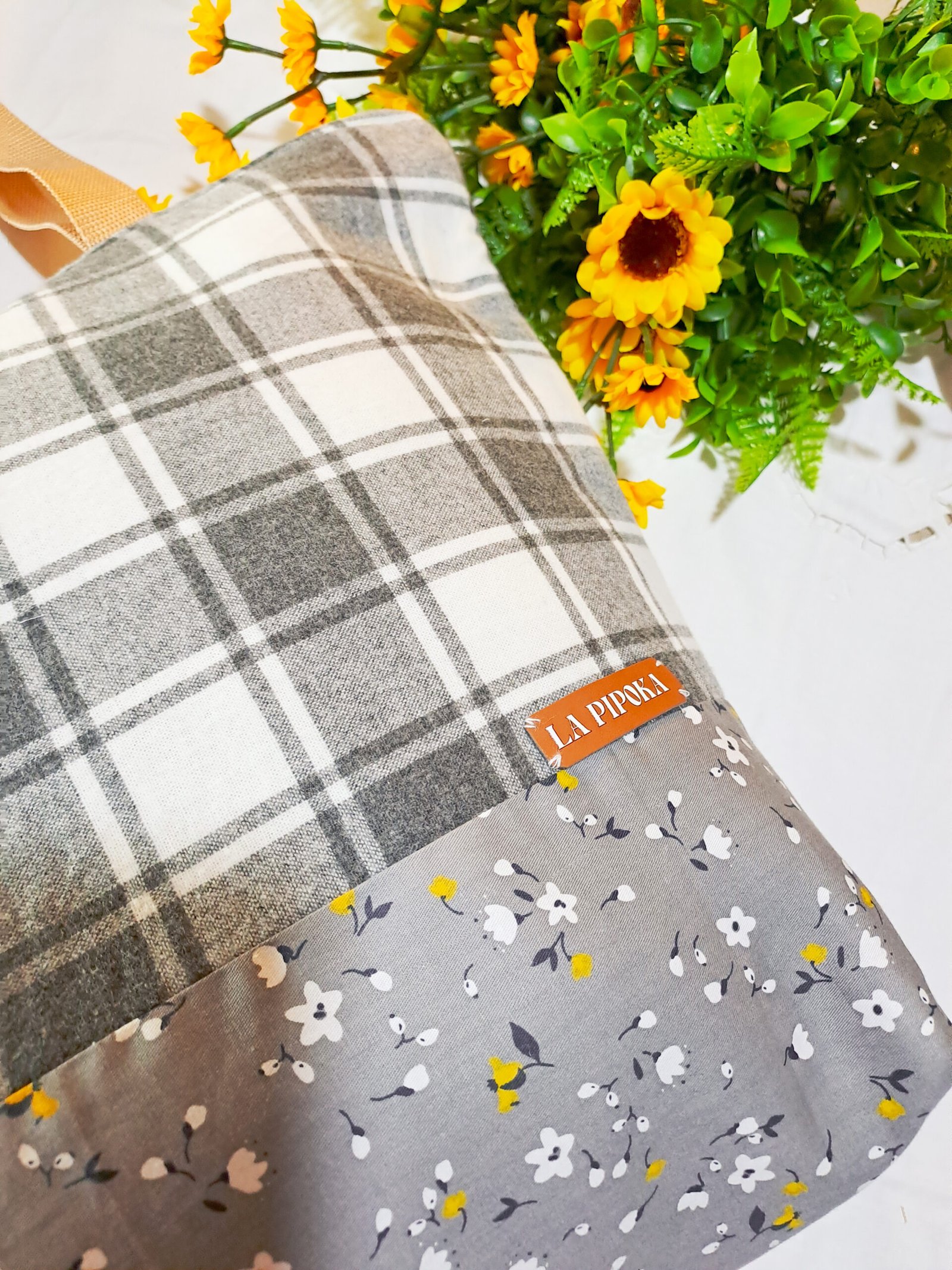 Design Sofisticado: Combinação de tecidos que se complementam na perfeição! A parte superior em tecido xadrez (tartan) em tons de branco e cinza confere um toque clássico e acolhedor, enquanto a base em tecido cinza floral com pequenas flores brancas e amarelas adiciona um charme delicado e primaveril.