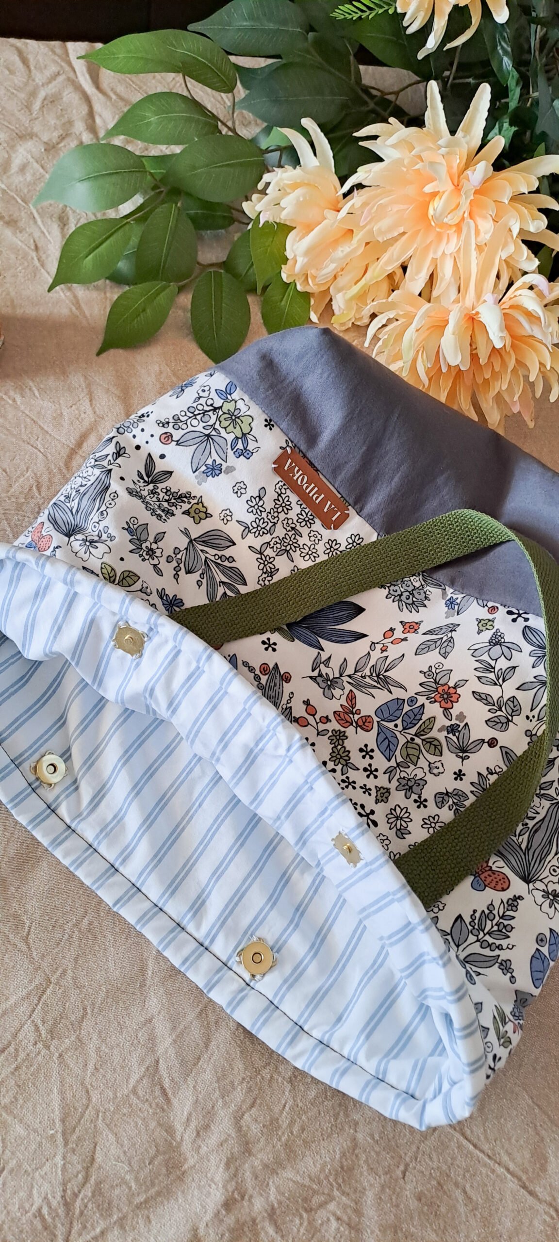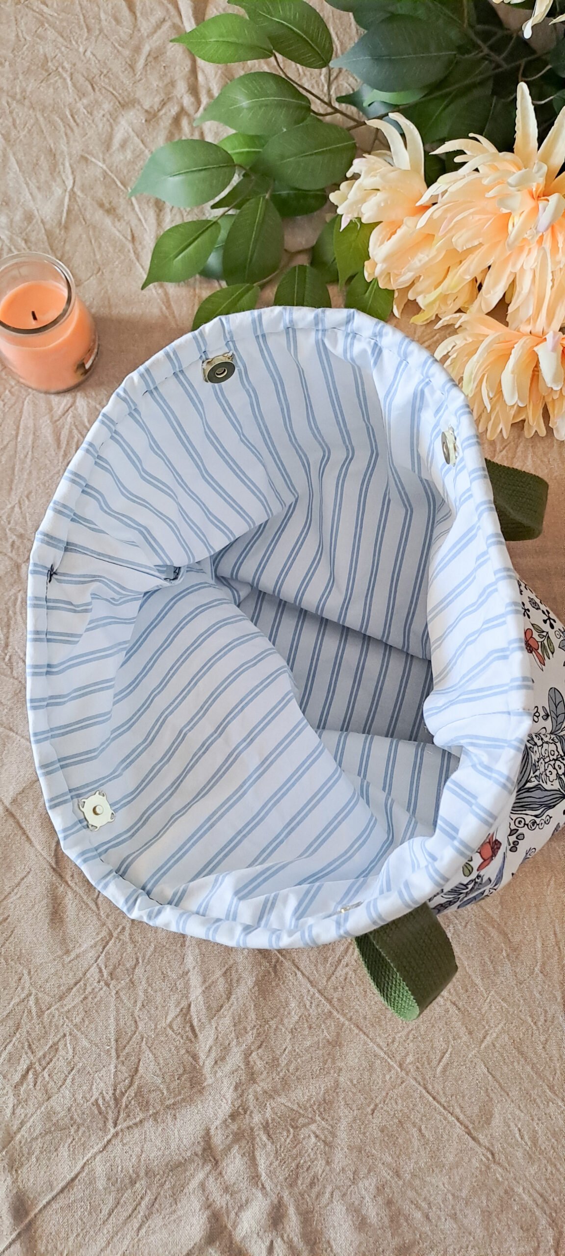 - Detalhes Surpreendentes no Interior: O forro (ou o topo reversível/dobrável) em riscas finas azuis e brancas adiciona um toque náutico e vintage, revelando a atenção ao detalhe.