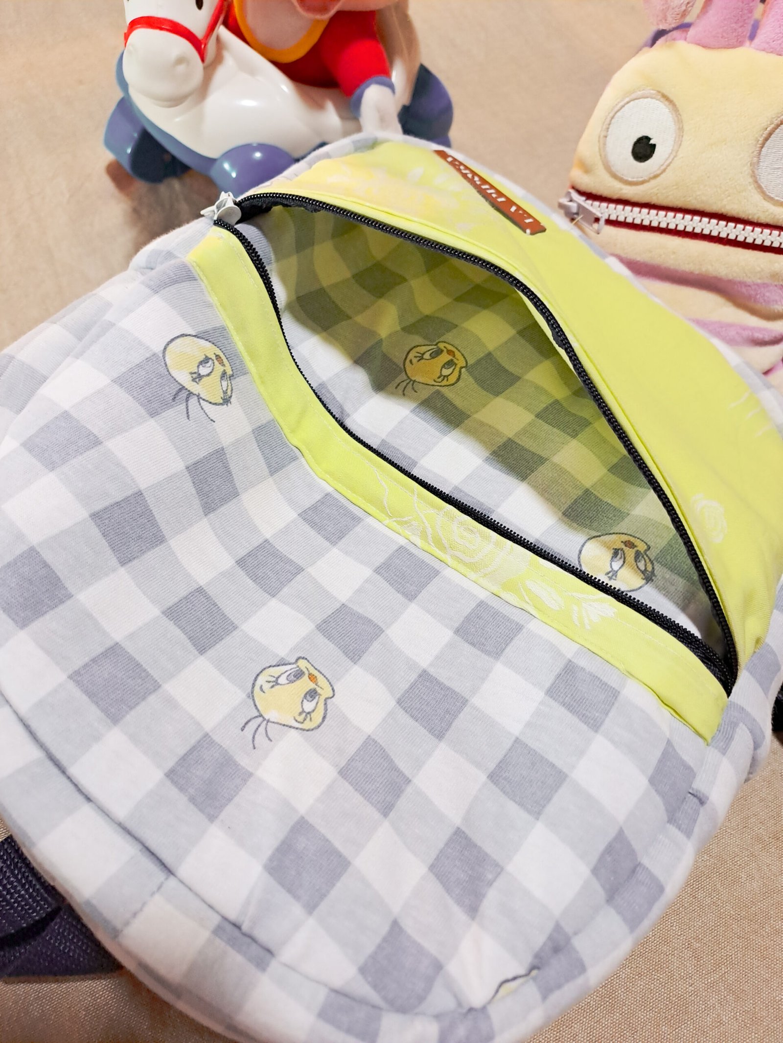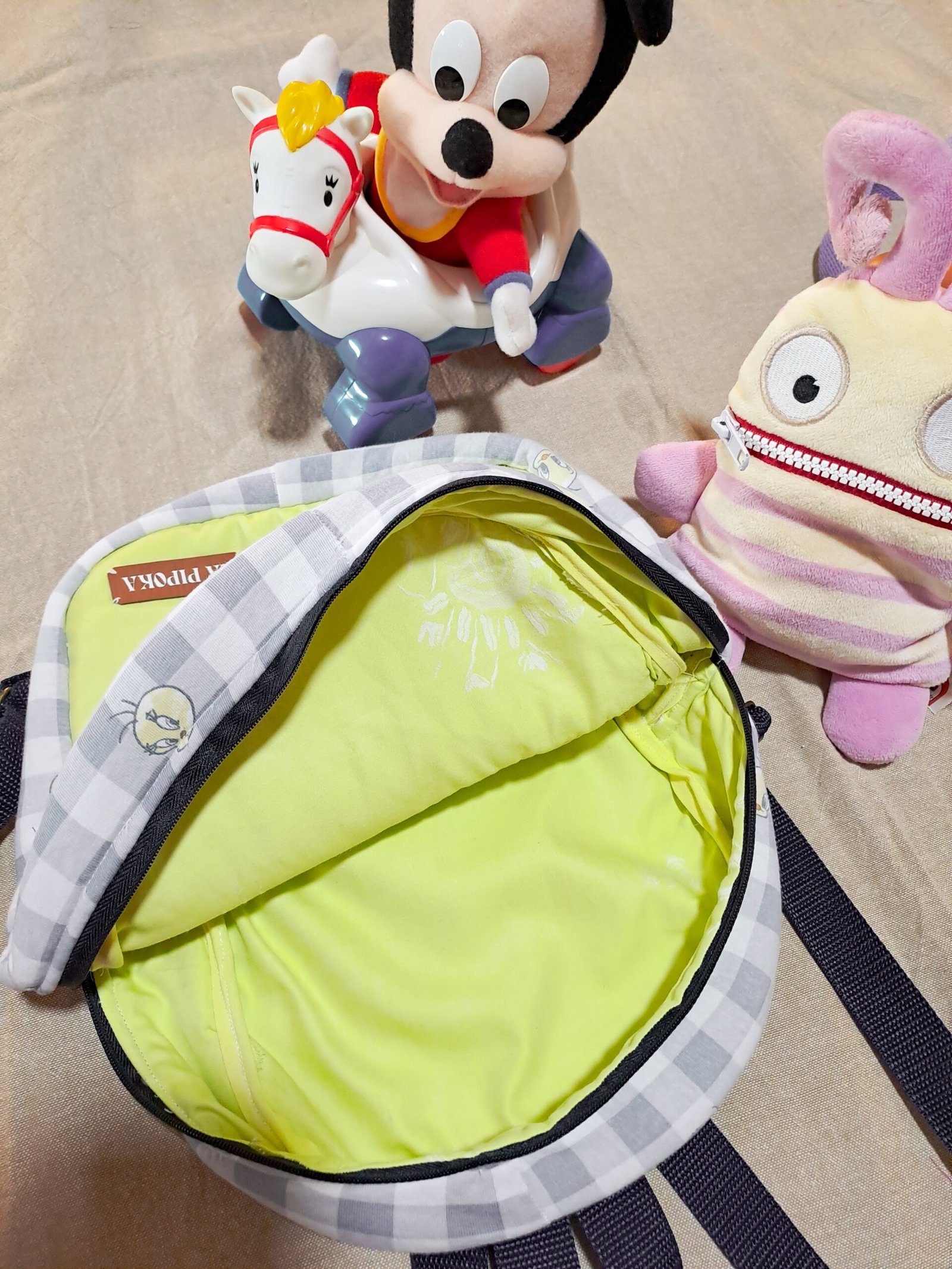 Interior Brilhante: O forro interior é num tom verde-lima neon que não só surpreende, como facilita a visualização e a limpeza, e é também decorado com o padrão de Piu-Piu.