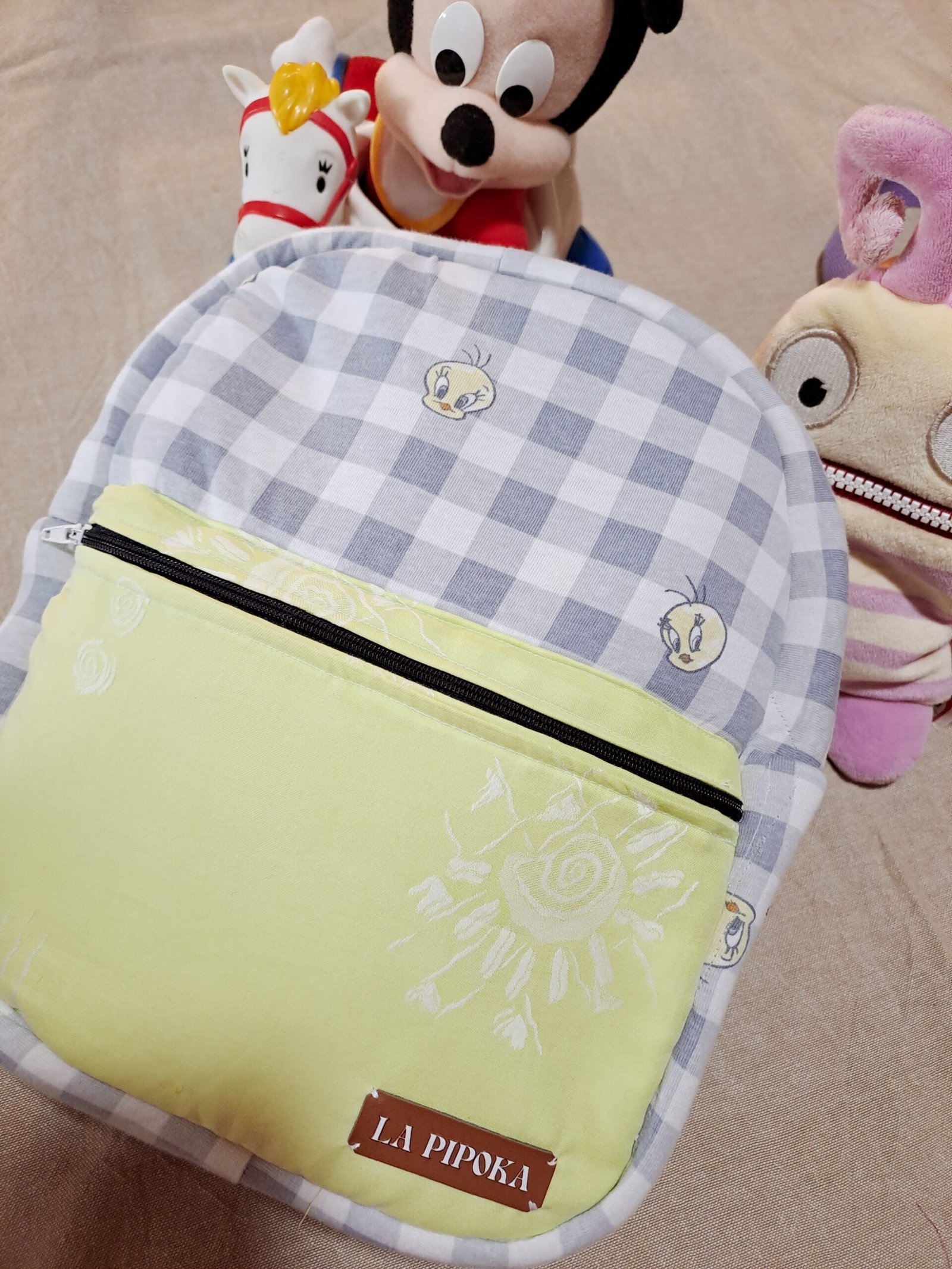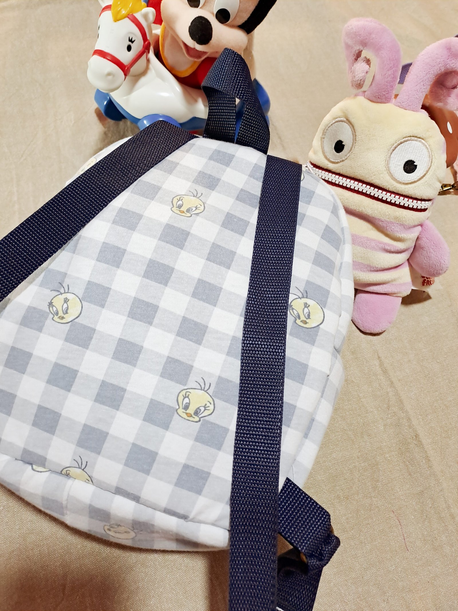 Padrão Clássico e Fofo: A mochila é feita com um tecido xadrez (vichy) em tons de branco e cinzento/azul claro, decorado com o rosto meigo do Piu-Piu (Tweety).